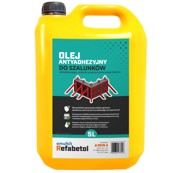 Refabetol to wysokiej jakości olej antyadhezyjny, przeznaczony do zabezpieczania szalunków i form betonowych przed przywieraniem betonu.